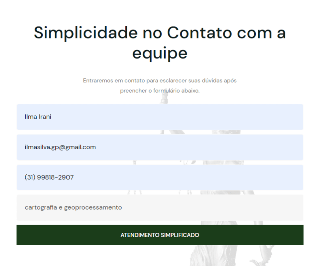 Preencha o formulário com seu nome, e-mail, n° do WhatsApp e á Área de Atuação que deseja atendimento.