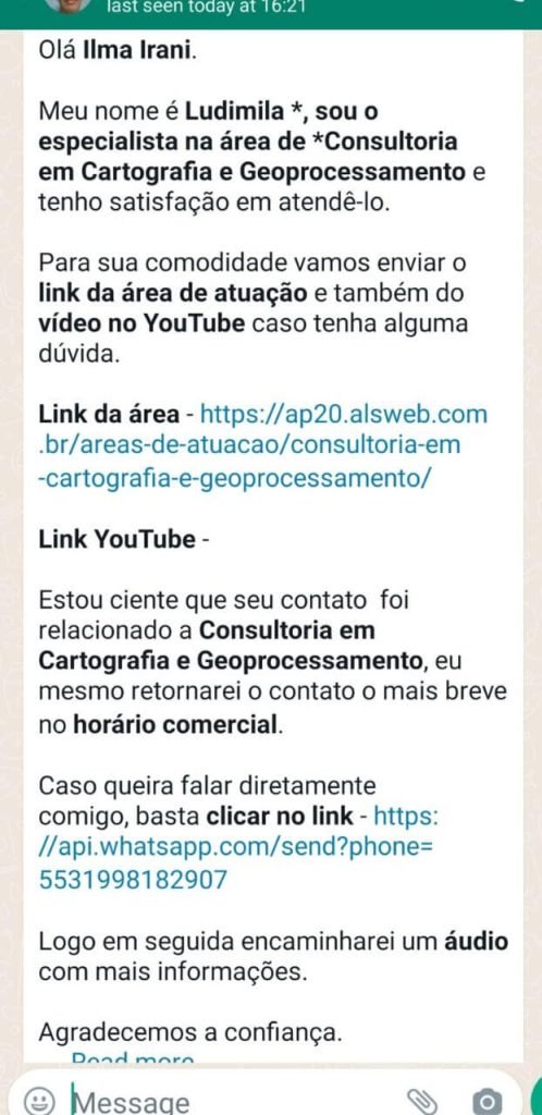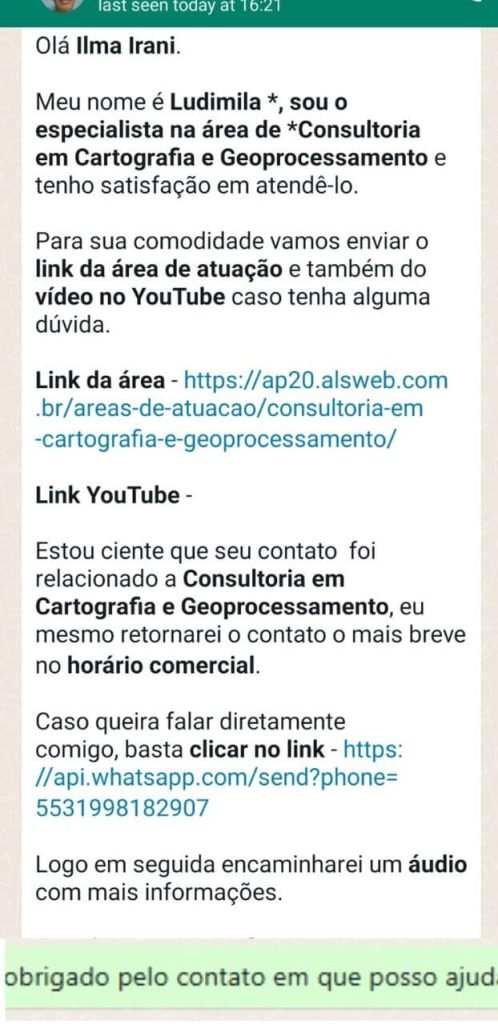 Receberá uma mensagem pelo WhatsApp confirmando seu contato e disponibilizando opções para atendimento.